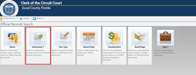 - Search the online Official Records to view the actual document. To search using the Clerk’s Instrument Number, choose the Instrument Number search option (outlined in red below) and enter the document number from your Property Fraud Alert.